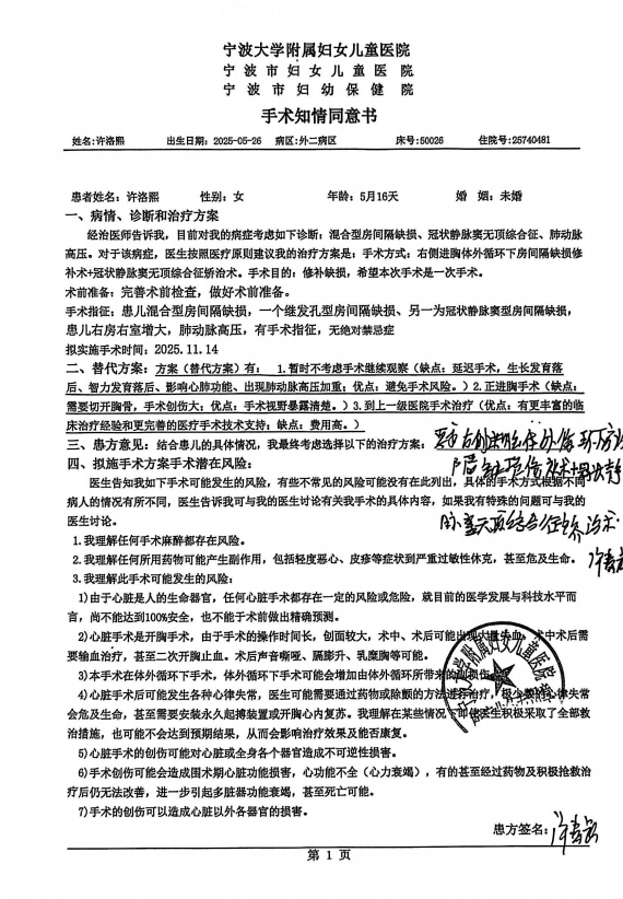 2.手术时长延长与术中沟通:属急症抢救所致。手术原计划3小时完成,最终耗时7小时,核心原因是术中突发“低心排+肺静脉回流异常”致命并发症,医生被迫中断常规流程转入紧急抢救,这是复杂手术的应急常态,并非“手术失误”。术中医生需集中全部精力抢救患儿,可能存在沟通回应简略的情况,但后续病情交代记录显示,医生已明确告知家属“手术难度大、患儿心肺功能差、需使用起搏器”等关键信息,不存在“刻意隐瞒病情”。